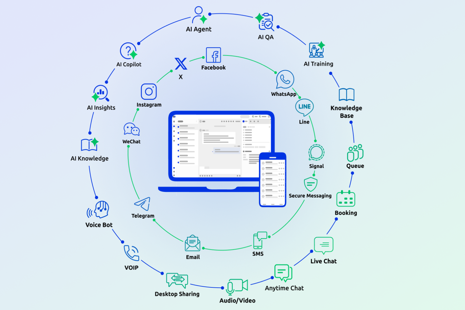 | Omnichannel Support | Supports live chat, email, SMS, social, and voice channels. | Focuses on live chat, chatbots, and social messaging only. |